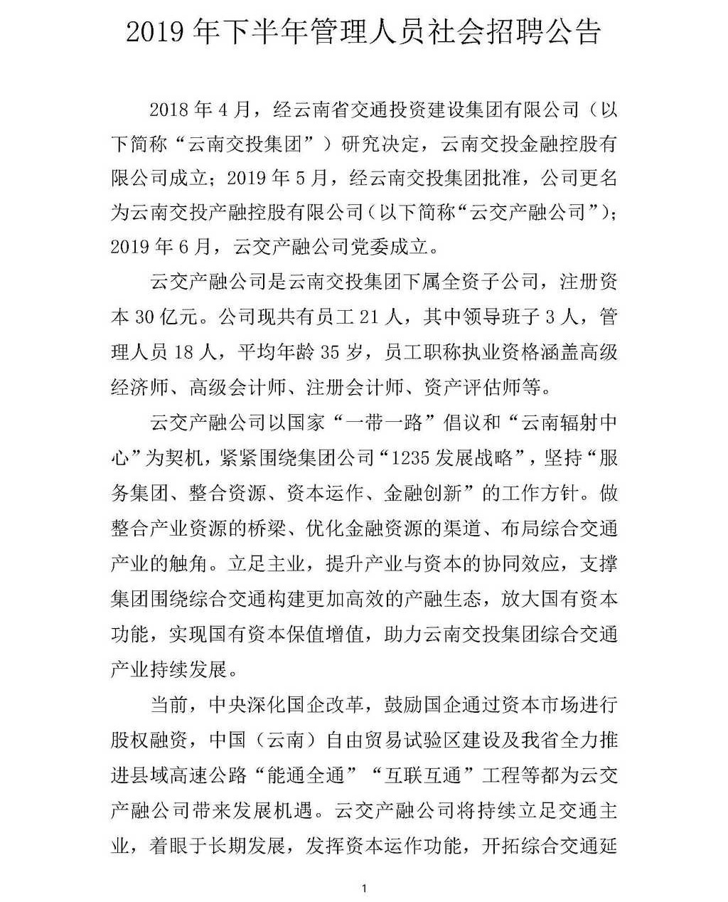 云南交投產(chǎn)融控股有限公司2019年下半年管理人員社會招聘公告