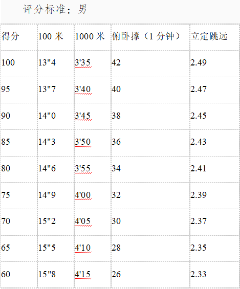 體能測試成績(男)=(100米+1000米+俯臥撐+立定跳遠)/4 。